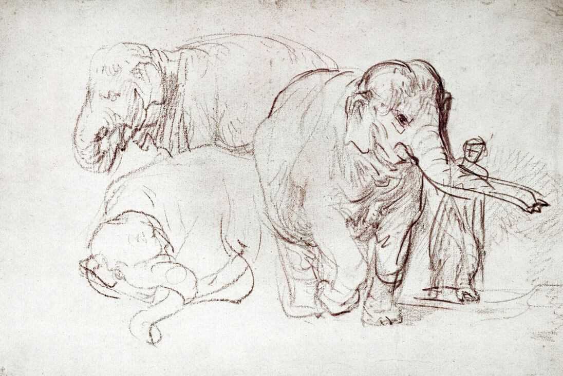 Дошедшие до нас рисунки Рембрандта, например, такие, как набросок слона и льва, выполненные итальянским карандашом, благодаря выразительной и довольно широкой штриховке оставляют впечатление массивности формы и мощи изображенных животных.