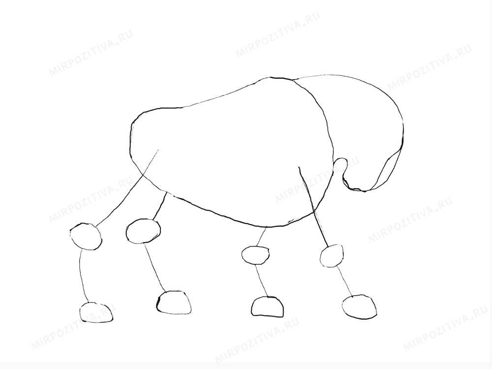 Сотрите лишние линии. Сделайте набросок конечностей: ног и хвоста. Переднюю согните в колене, у задней тоже изобразите небольшой изгиб. На концах линий нарисуйте копыта.