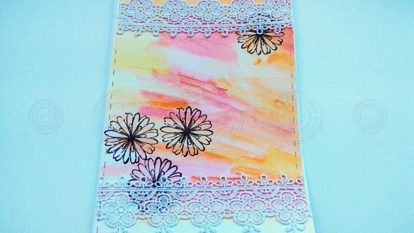 1. Итак, для начала подготовьте фон. Мастер-класс по его изготовлению вы также можете найти на нашем сайте. Напомним быстро методику работы. На плотной акварельной бумаге красками нанесите штрихи, создавая неравномерное покрытие, например, используя желтые, оранжевые и розовые цвета. Затем воспользуйтесь специальными штампами в виде цветочков, штемпельными подушечками, чтобы нанести несколько оттисков. Часть оттисков вырежьте по контуру, а часть бумаги с рисунком оставьте для того, чтобы в дальнейшем получился фон для открытки. Вот и вся работа. Когда высохнут чернила, у вас получится замечательная и полезная поделка своими руками.