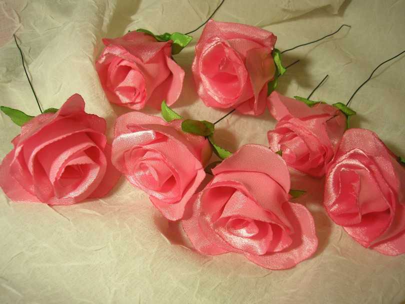 Такой вариант изготовления роз из ткани своими руками является достаточно трудоемким, однако цветы при этом получаются необыкновенно красивыми. Особенно празднично выглядят атласные букеты, которые вполне можно подарить на свадьбу или день рождения.