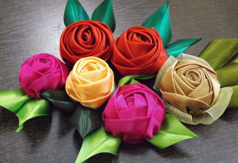 Эта техника универсальна, поскольку позволяет изготавливать цветы как из заготовок, вырезанных из ткани, так и применять ленты из органзы. Суть в том, что каждый лепесток представляет собой многократно сложенную ткань. Фиксировать отдельные элементы можно на нитку или подплавлять над пламенем края, таким образом склеивая их между собой.