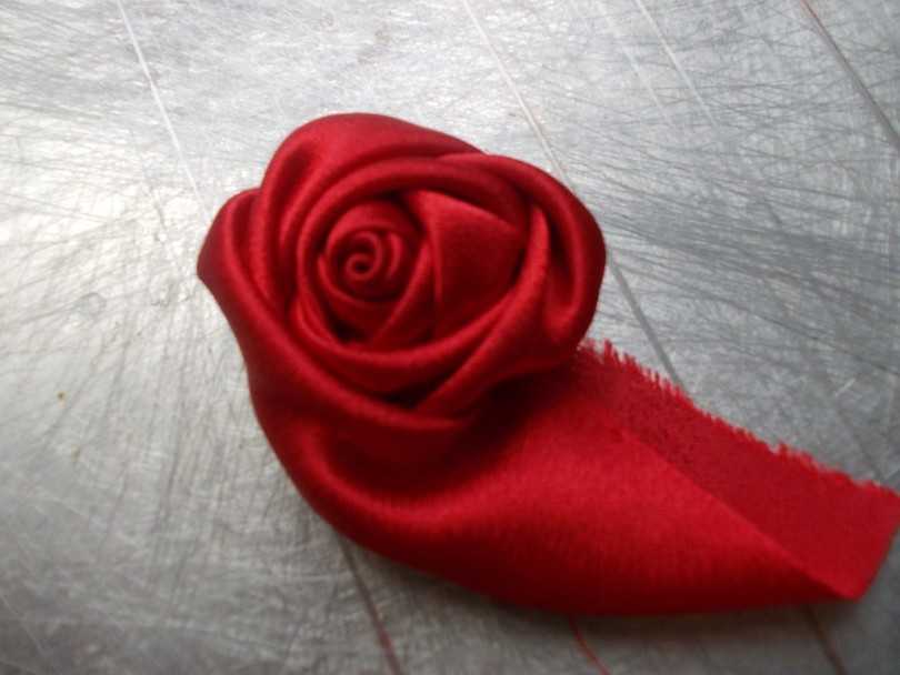 Скручивая получившуюся ленту в рулон, можно заметить, как начинает вырисовываться симпатичный внешний вид, складки в этот момент должны располагаться снаружи. Каждый виток аккуратно закрепляется по внутреннему краю, если изготовление розы предполагает раскрытую форму бутона, это корректируется плотностью сматывания рулона.
