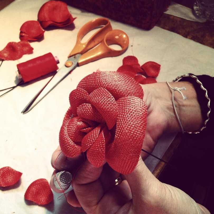 Для придания естественных изгибов лепесток-заготовку укладывают на специальную подушечку и проходят по нему горячим инструментом. Затем из готовых лепестков на нитке собирается цветок.