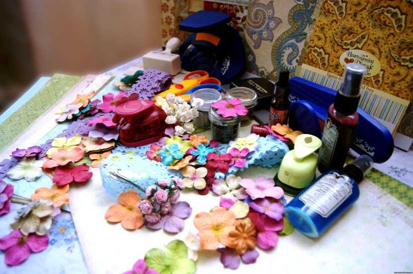 Для работы понадобится скрап-бумага, которую нужно подбирать для создания отличной композиции. В продаже можно встретить наборы такой бумаги, в которой процесс подбора уже осуществлён. Такой вариант прекрасно подойдёт для начинающих мастериц. Ещё понадобятся ножницы разной длины и формы. Клей и скотч помогут закрепить украшения на обложке и страницах альбома, но стоит подбирать клеящий материал в зависимости от его назначения. Прекрасным помощником станет и дырокол, потребуется и обычный, и фигурный. Штампы, при помощи которых легко наносятся различные рисунки. При работе с ними стоит учитывать, что стереть их невозможно. Специальный «резак», который для новичков смогут заменить доступные линейка и канцелярский нож. Чтоб не портить рабочую поверхность стола, резать нужно на специальном коврике. Ну и, пожалуй, самым главным являются декоративные элементы, из которых будет составляться композиция украшения. Они доступны в любом магазине с материалами для рукоделия.