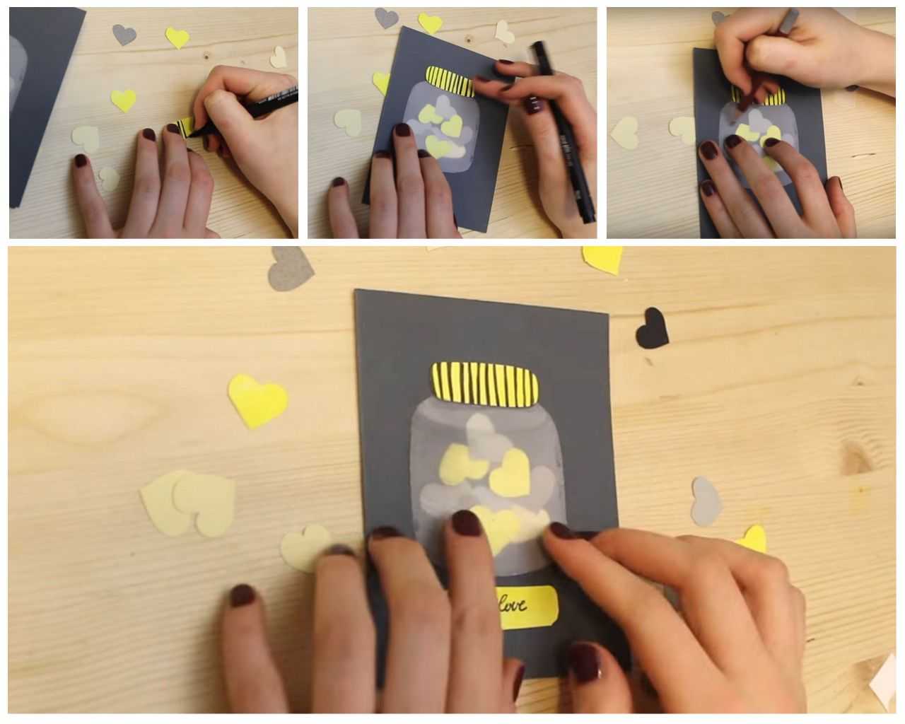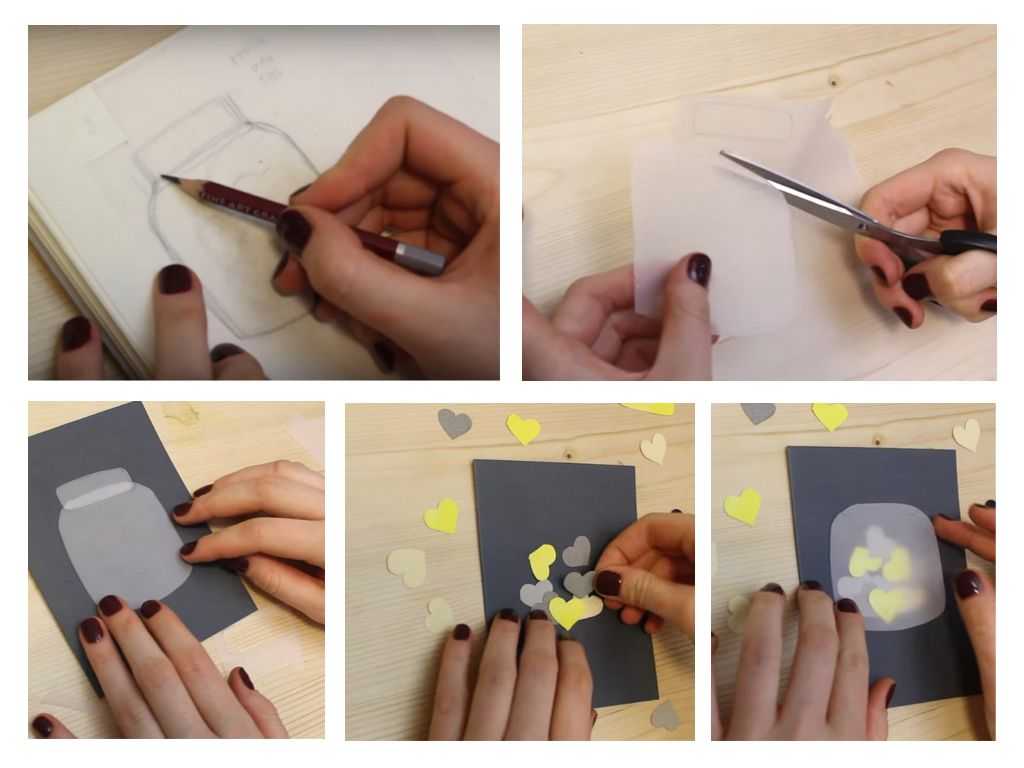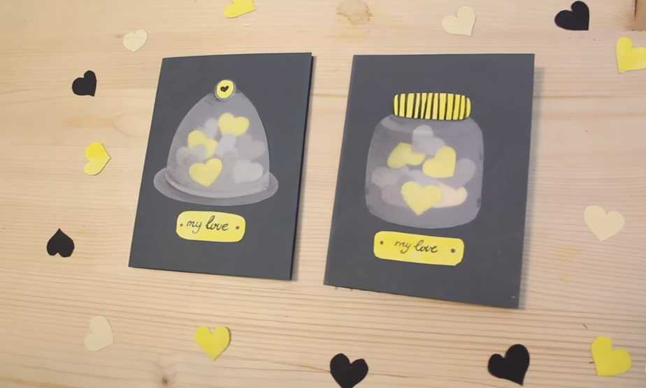 У меня есть для вас две идеи открыток. Выполняются они в техники аппликации и труда составить не должны. Первая открытка будет из конвертиков с пожеланиями, а вторая — иллюстрация банки и стеклянного колпака с сердечками. Давайте начнем.