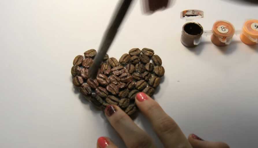 Когда валентинку заполните кофейными зернами, можно покрыть ее акриловой краской в цвет зерен, но это совсем не обязательно.