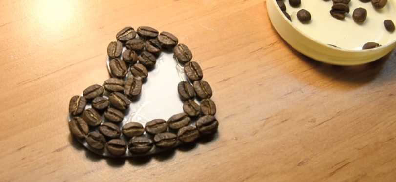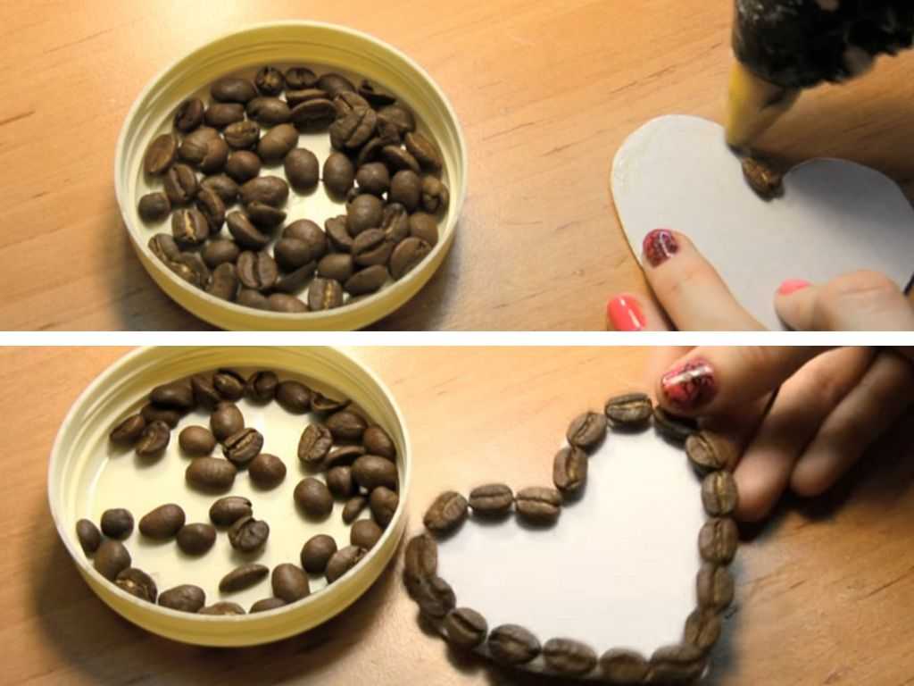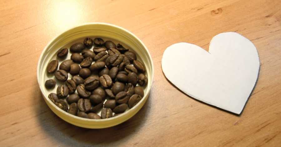 Для начала необходимо вырезать основу в виде сердца из картона и приготовить зерна кофе, чтобы удобнее было их брать, насыпьте их в крышечку, например от крема.