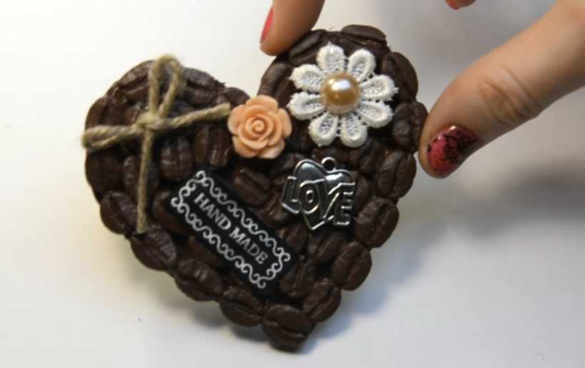 Такая валентинка отлично может быть использована как милый магнит на холодильник или красивая и стильная подвеска. А зерна кофе еще и будут дарить прекрасный аромат.