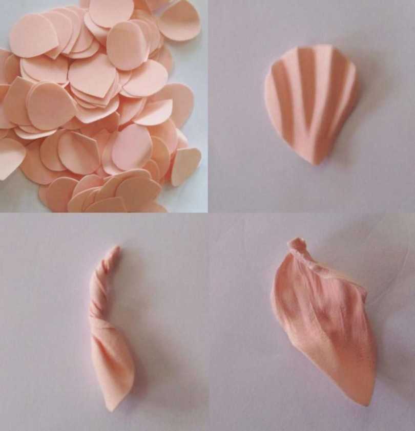 - Чтобы придать форму маленьким лепесткам, их нужно нагреть с помощью утюга, и вдавить булькой в кусок поролона. Чашелистики также нужно нагреть и вдавить их серединку в поролон. Обрабатывать температурой листочки нужно с помощью плойки, после чего, на них нужно нарисовать деревянной шпажкой жилки. Средние лепестки нужно обрабатывать также как и маленькие, но бульку вдавливать не сильно, и только посередине. Большие лепестки нужно разогреть, и закрутить по спирали, после чего аккуратно распрямить.