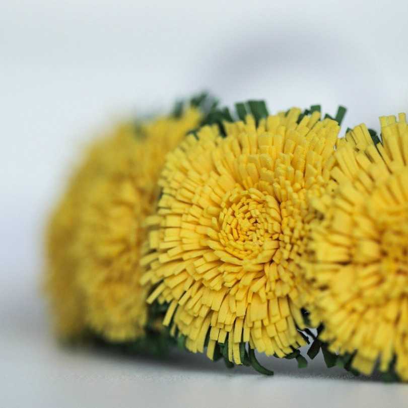 14.Берем желтые соцветия и так же подносим к утюгу. Цветок разворачивается и получается желтый одуванчик.