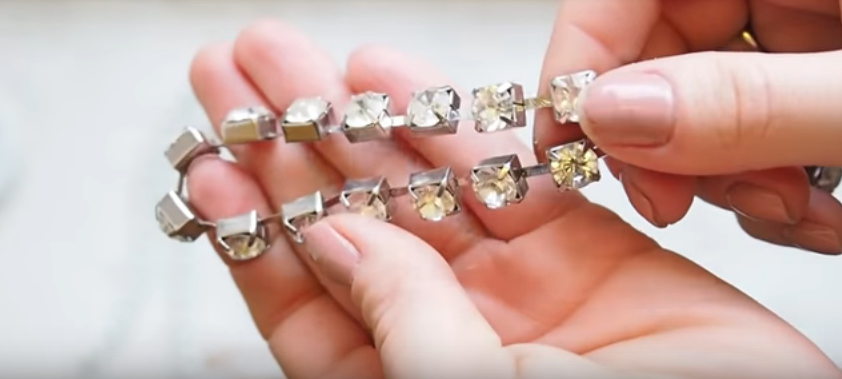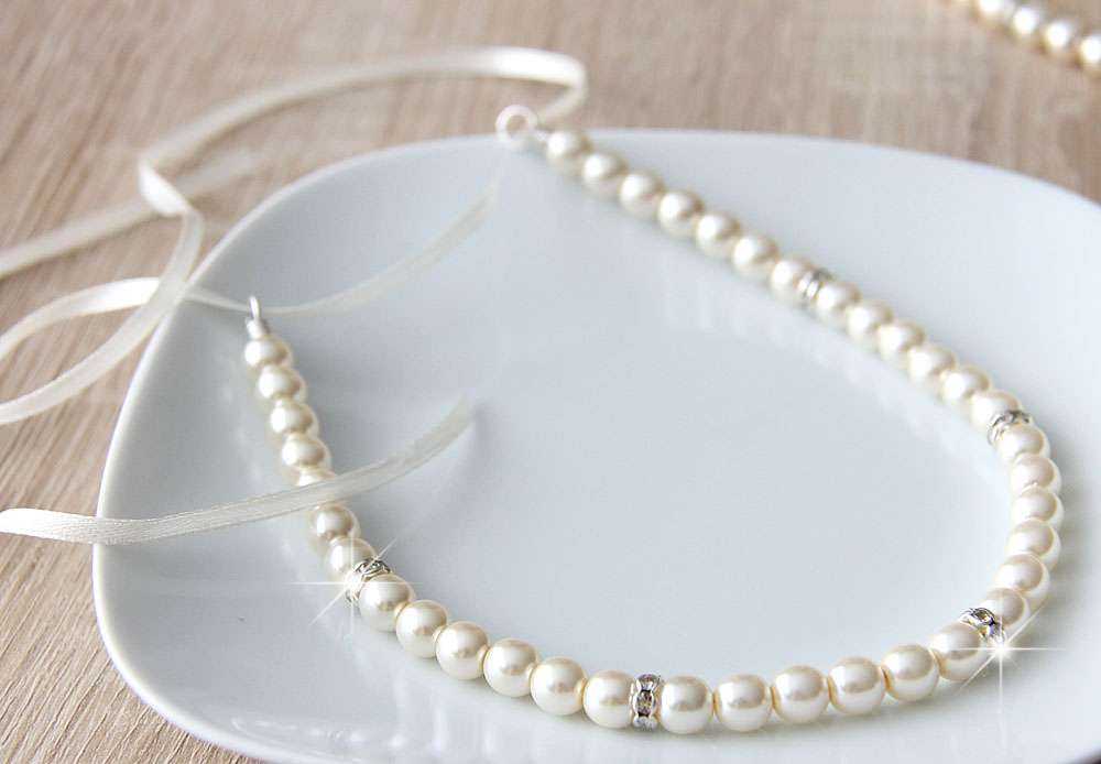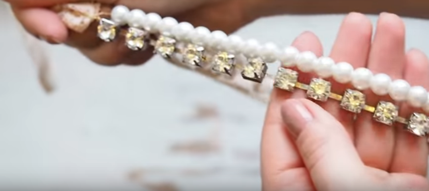соединить в венок жемчужную нить и цепочку со стразами, протянув сквозь петли атласную ленту или кружево, завязав их бантом.