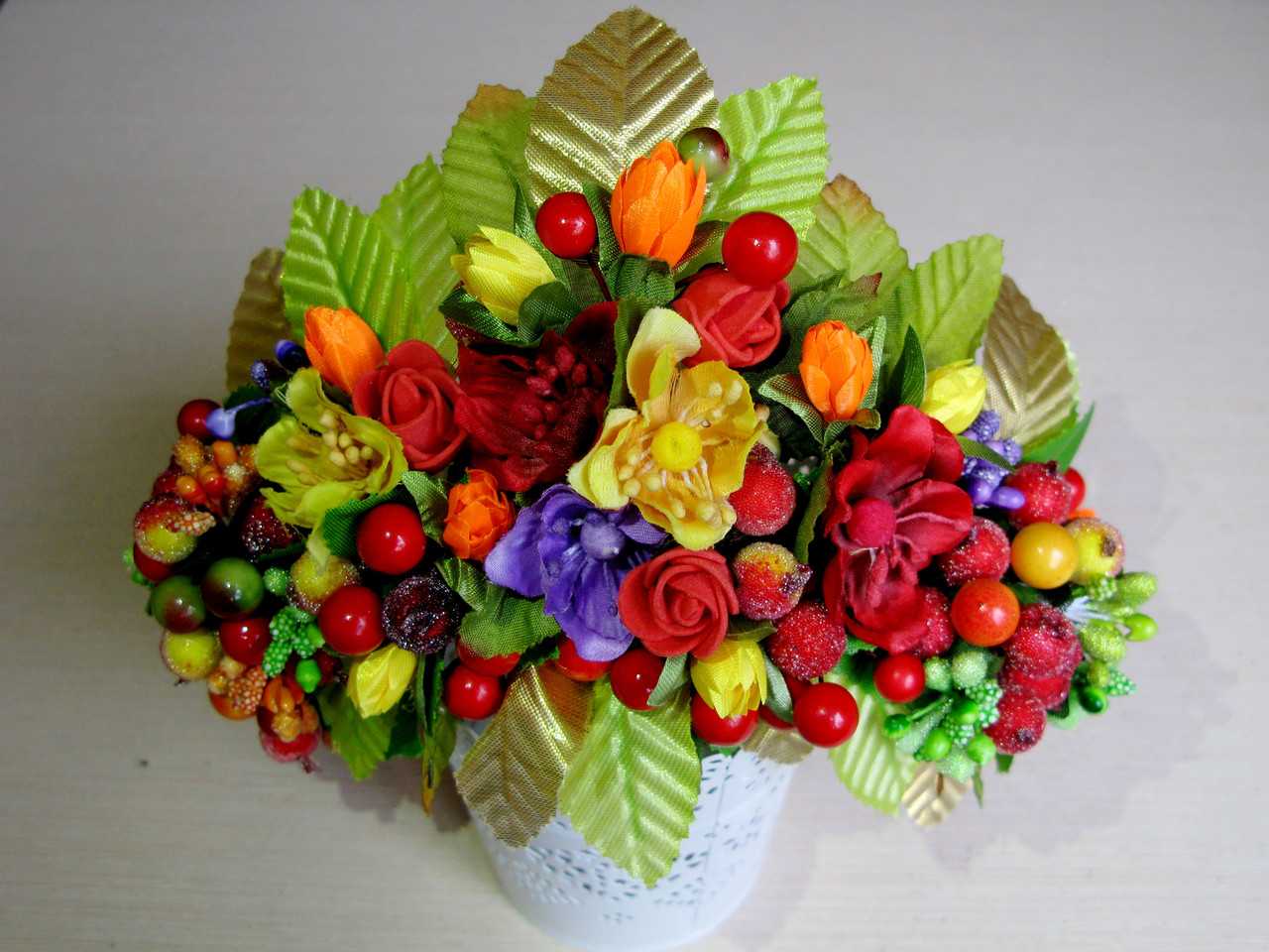 - искусственные цветы, гармонично сочетающиеся между собой по цвету;