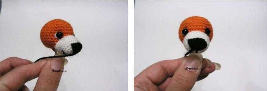 - Стежок влево и вправо на 6-7 сбн, чтобы получилась улыбка. Закрепить нитку и отрезать.