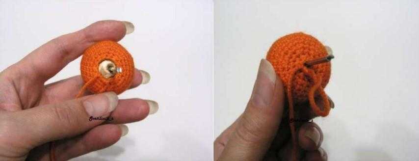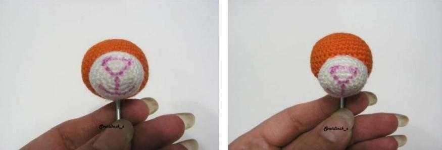 - 2 ряд: 9 сбн, нить закрепить, на оранжевых частях оставить для закрепления. Сложить оранжевые и белые части друг с другом. Сшить черной ниткой.