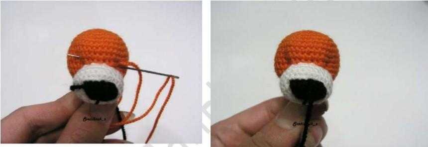 - Заполнить нос черной нитью, не обрезая, сделать стежок вниз по центру и в длину 4 ряда.