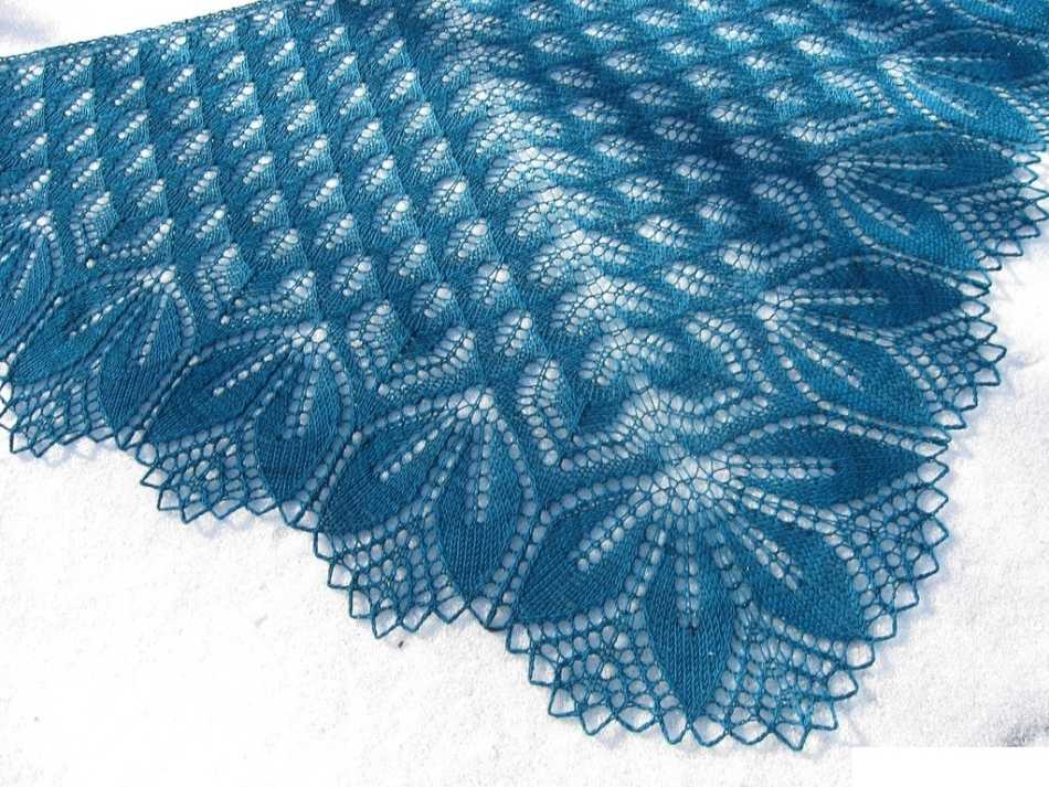 - день. Выполняется из тонкой пуховой либо пряжи шелковой. Узор платка достаточно сложный. Но итоге в изделие получается нежное и тонкое, оно даже проходит через колечко.