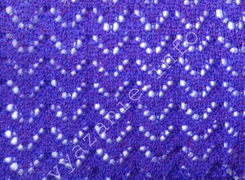 Мелкий узор с одним накидом в рапорте из 3 петель. Хорошо выглядит при вязании из хлопковой пряжи.