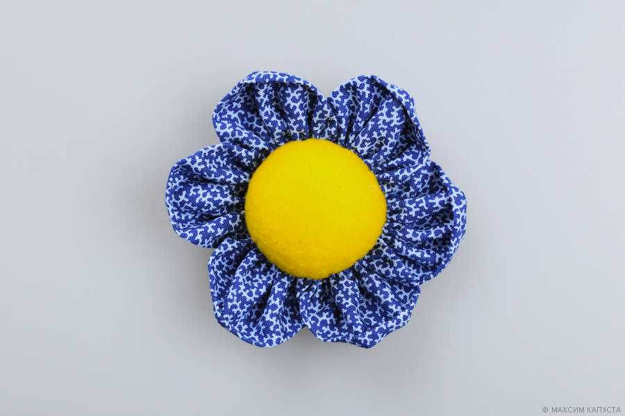 С помощью потайного шва пришиваем цветочек к основанию (жёлтому кругляшку из фетра, пришитому к браслету), не забывая проложить пластиковую или картонную заготовку внутрь.