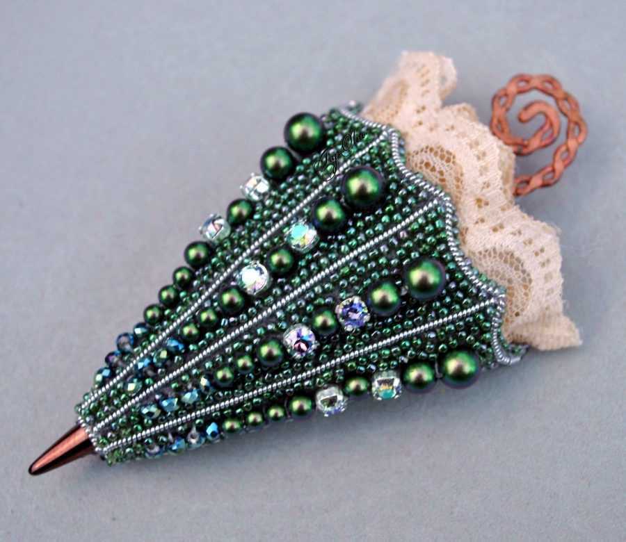 Взять черную проволоку, примерно 12 см, одеть на нее зерна, использовавшиеся для контура. Можно использовать и более крупные бусины. Пришить проволоку к шляпке так, чтобы получились пипка и ручка зонтика. К изнанке приклеить уплотнитель из картона и застежку.
