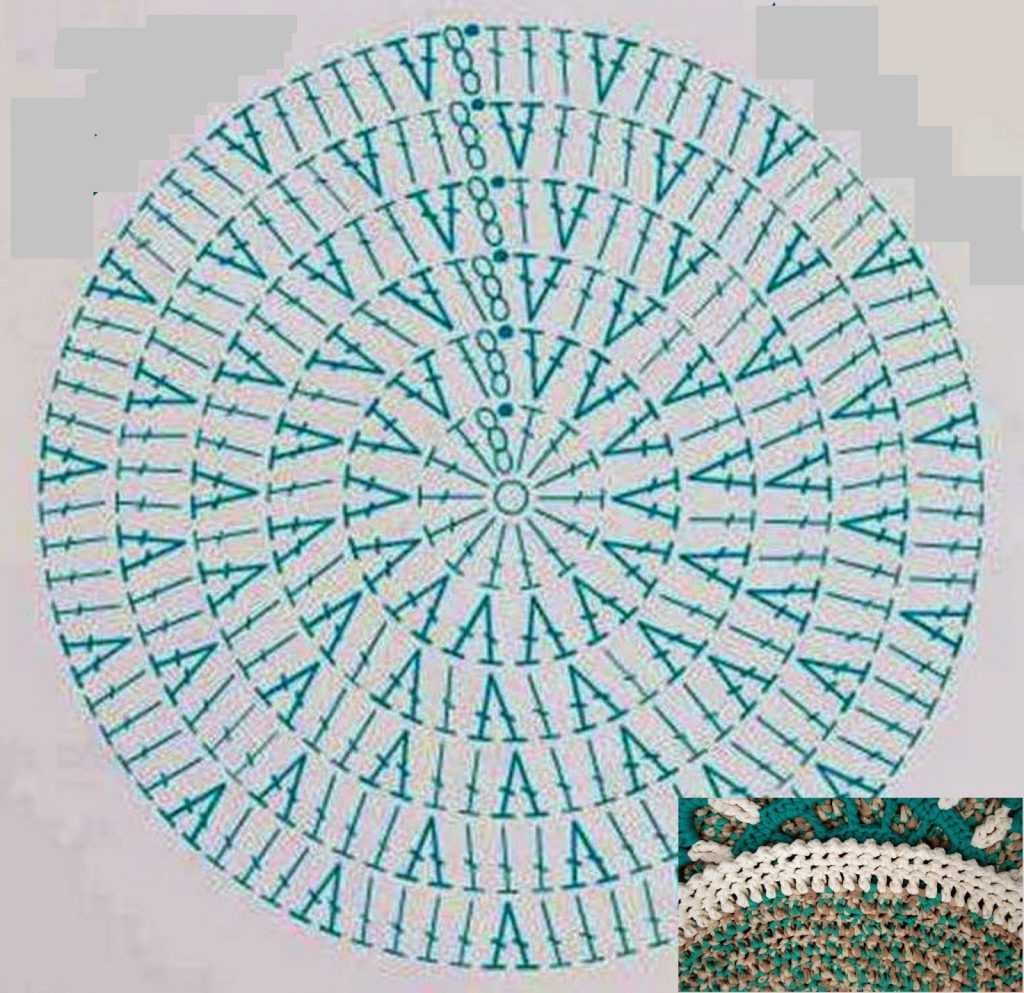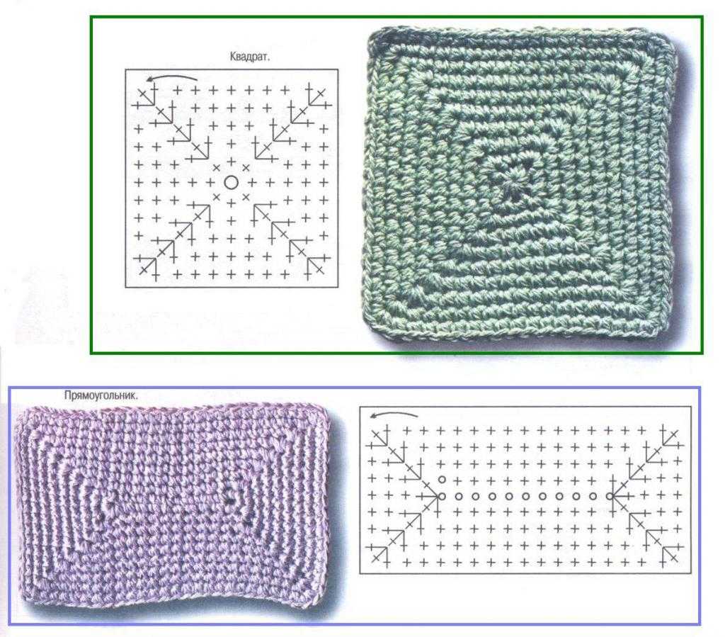 Последний ряд простого круга (схема вверху) или квадратика обвязан рачим шагом, что придает законченный вид изделию и очень красивое оформление края.