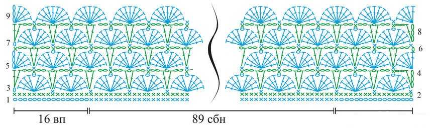 В 5м ряду: вязание аналогично предыдущему ряду, добавляя ещё 1 ст.с/н в каждый «веер» узора. В 6м между веерами по 3 в.п., в 7м – 9м рядах – по 4 в.п.