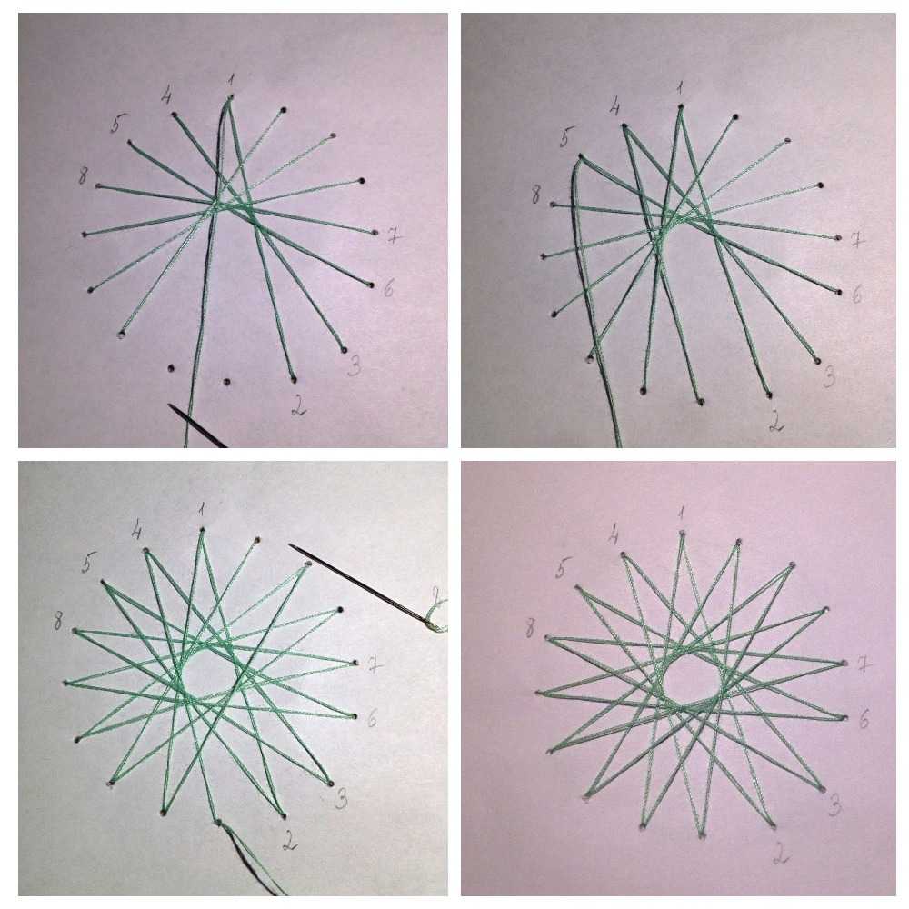 На первых порах точки круга стоит пронумеровать, чтобы не сбиться с последовательности, в которой планируется заполнение. Начинать следует с точки, обозначенной цифрой 1 и двигаться в соответствии с цифрами, обозначающими следующие стежки.