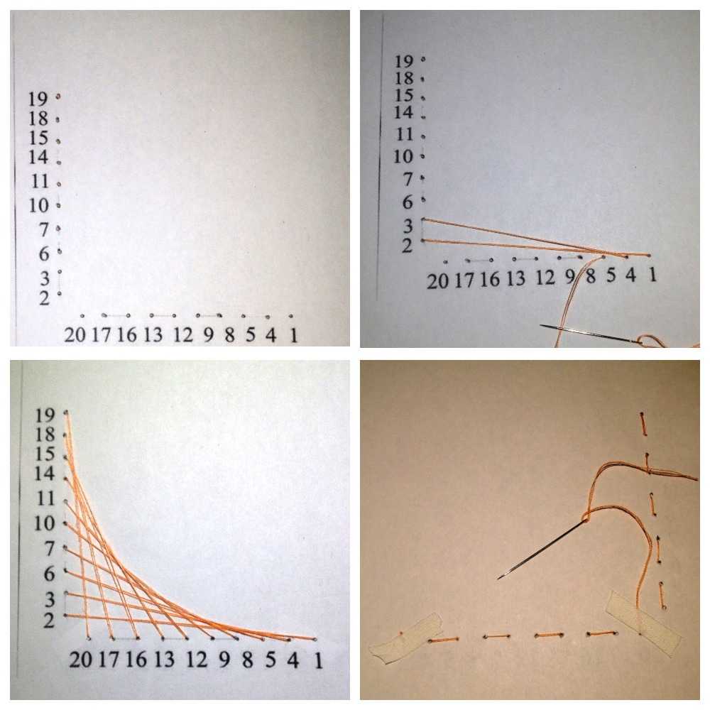 При помощи линейки делается чертеж угла. Его стороны делятся на одинаковое количество частей с одной стороны и с другой. В вершину угла прокол не делается. Первый стежок делают продевая иглу с нитью с изнаночной стороны, а далее все делается по схеме.