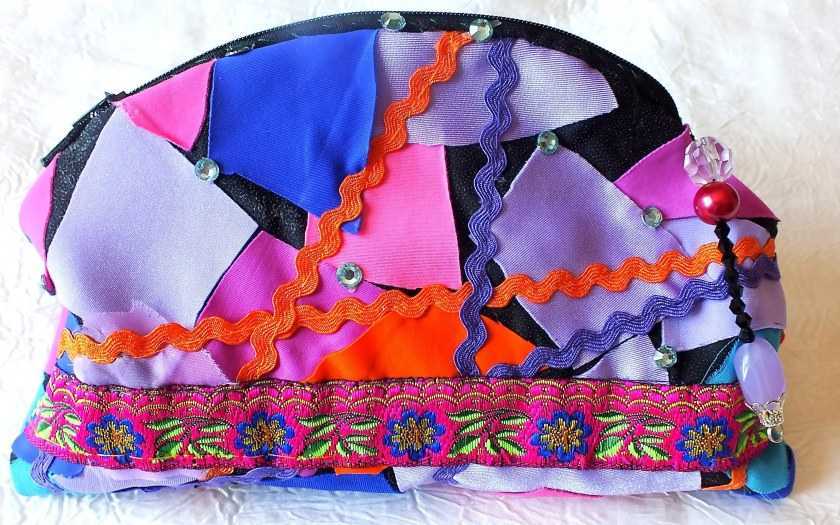 Этот способ является самым популярным и менее затратным по времени. Работая с тканью, можно выбрать произвольные размеры и форму аксессуара для косметики, а для украшения готового изделия использовать декоративные элементы: бисер, стразы, ленты или аппликации.