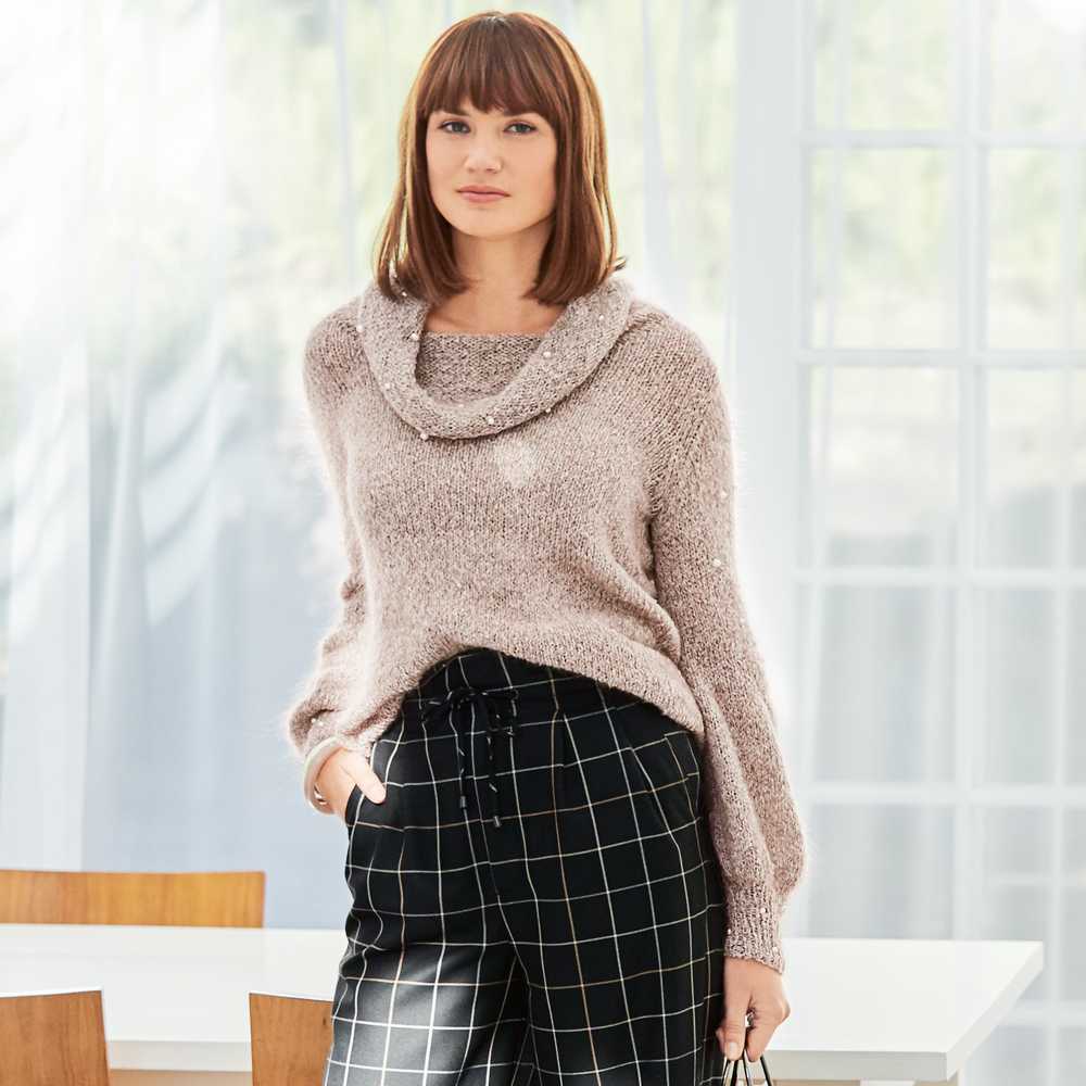 Модель пуловера, которая объединила в себе два тренда 2019–2020 года: люрекс и удлинённые широкие рукава. Вы только посмотрите, насколько женственным получается образ! Удивительно, как простой базовый пуловер может превратиться в оригинальный элемент гардероба, благодаря металлизированной нити и лентам на рукавах.