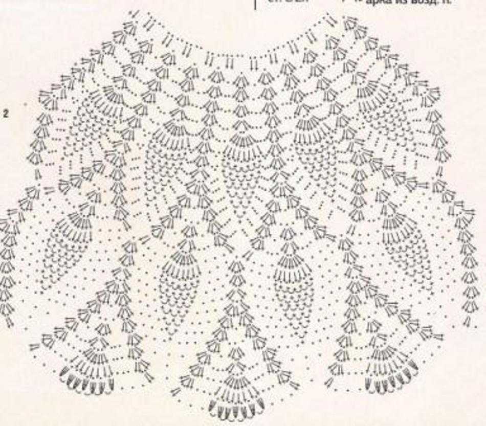 - 2 ряд — 2 столбика с накидом в одну петлю, 1 воздушная, 2 столбика с накидом в одну петлю, 2 петли пропустить. Повторять весь ряд,