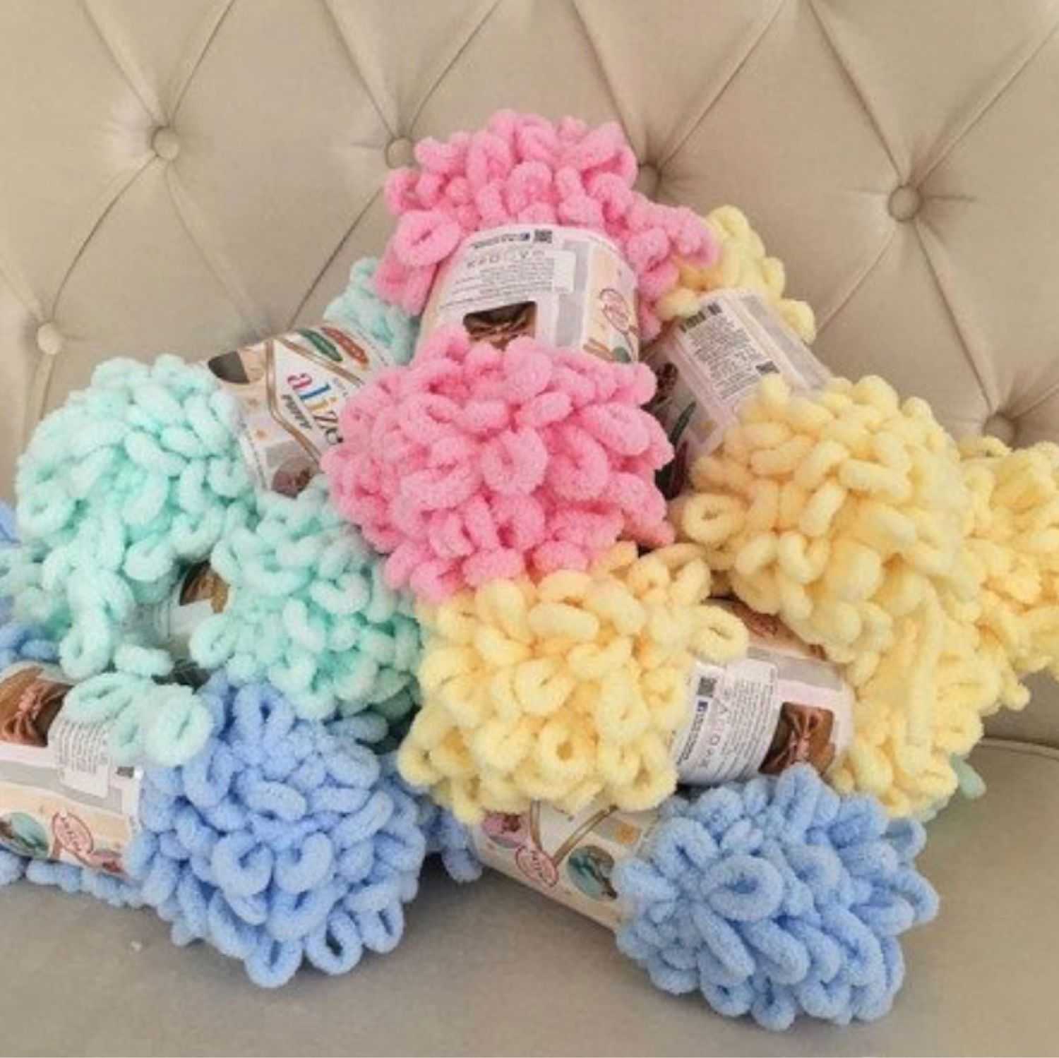 Среди явных достоинств этого вида рукоделия выделяется именно то, что для него не нужны ни спицы, ни крючок. В продаже не так часто можно найти спицы № 12-15 или крючок такого диаметра. Это не значит, что Alize Puffy нельзя вязать, используя инструменты. Для этого нужно вытягивать не нитку от клубка, а сразу готовую петлю.