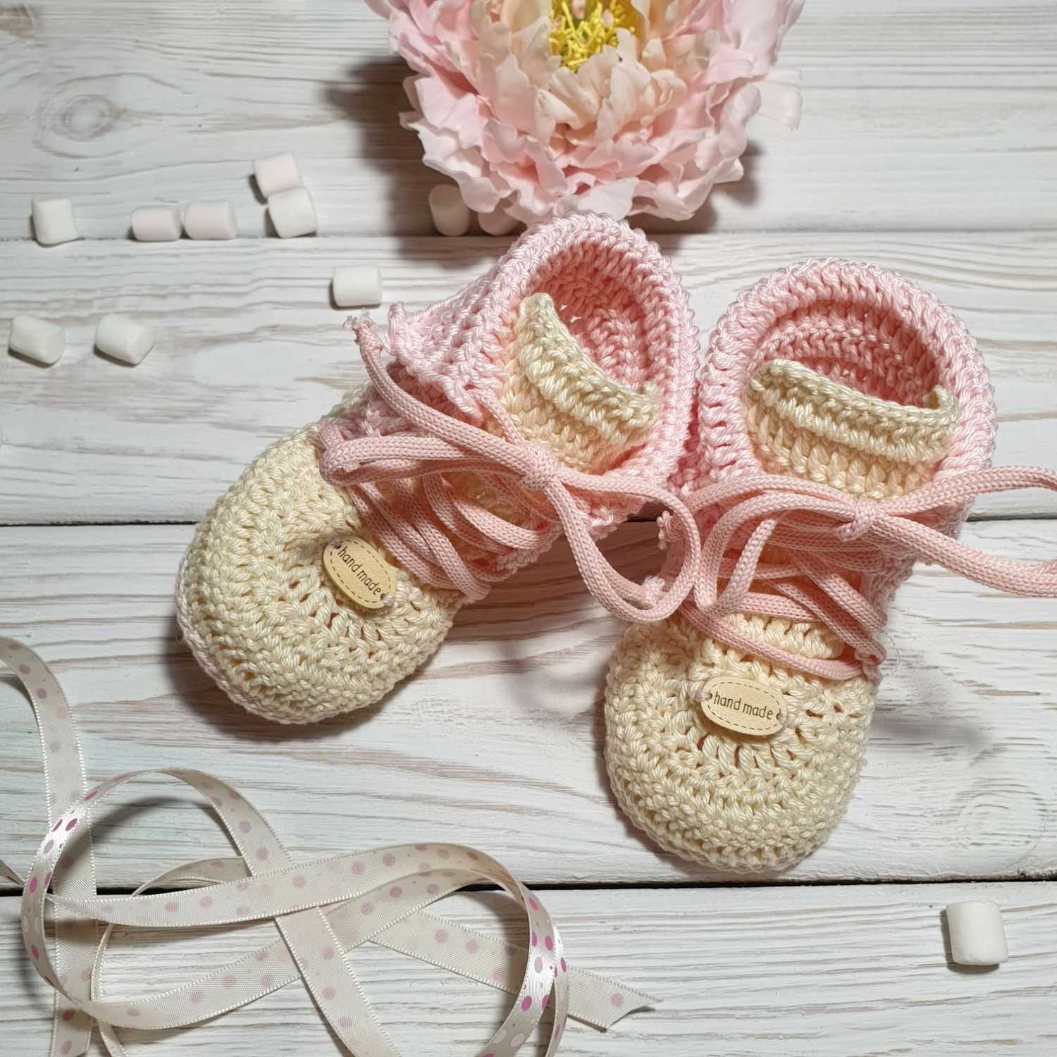 Такие пинетки стоит вязать крючком, используя нитки двух цветов. Сначала вяжется стопа. Потом ее обвязывают по краю, чтобы сделать лодочку. Дальше формируют бортик (лучше другим цветом). Язычок нужно связать отдельно и пришить к переднему краю изделия. Шнурки делают из воздушных петель и вдевают в подготовленные дырочки.