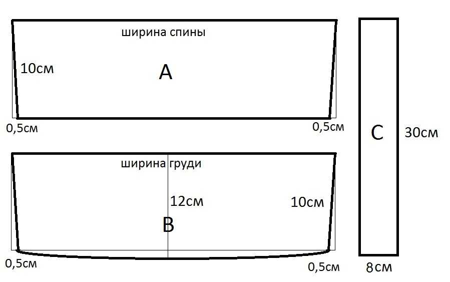 Из оставшейся ткани вырезаем кокетку (рис. А и Б) и будущие лямки (рис. С). Прострачиваем кокетку по бокам.