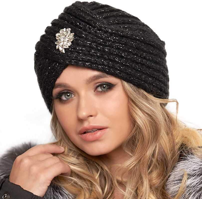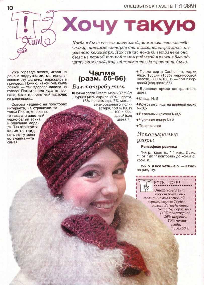 Шапка-чалма в исполнении сложнее, чем повязка. Она закрывает верхнюю часть головы, защищая от холода. Ее вяжут разными узорами, оформляя в районе лба замысловатое переплетение, которое отличает чалму от других головных уборов.