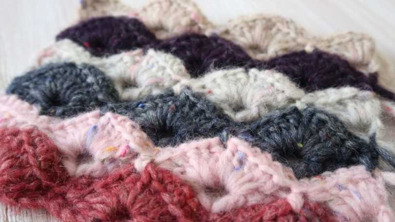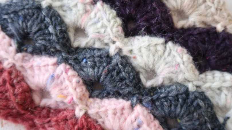 - Из крупной мега-пряжи, когда вяжут на руках или очень толстыми спицами, лучше «не заморачиваться» с узором. Лучше вязать только лицевыми петлями, полотно само немного закрутится по краям, изделие мягко задрапирует шею.