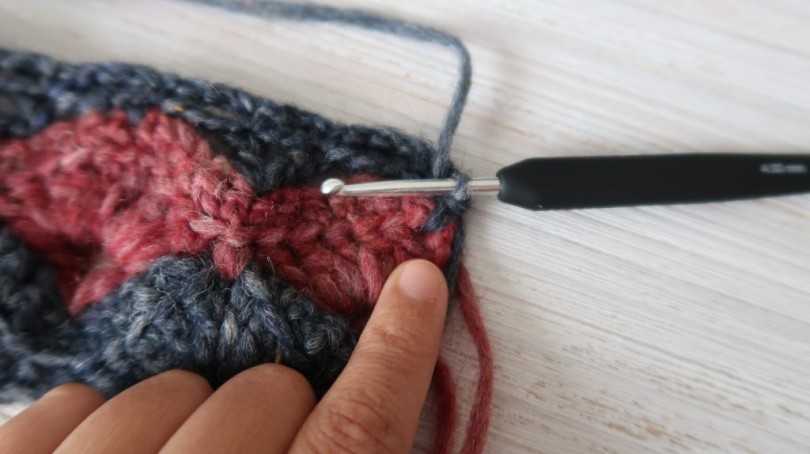 - Когда мы провяжем всю высоту, пора делать убавки для закругления капюшона. Провязываем вместе петельки в середине изделия.
