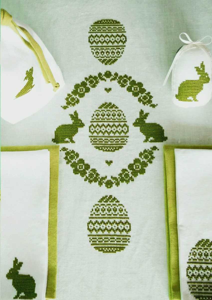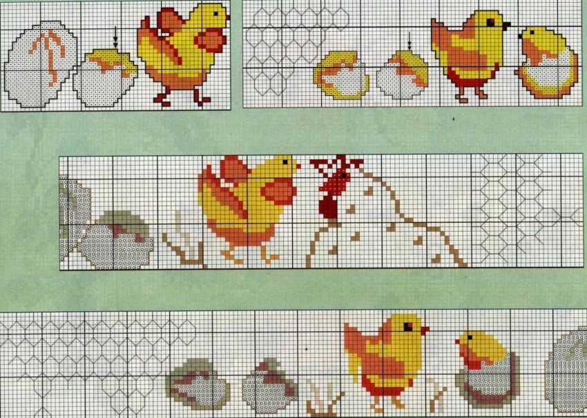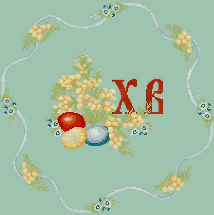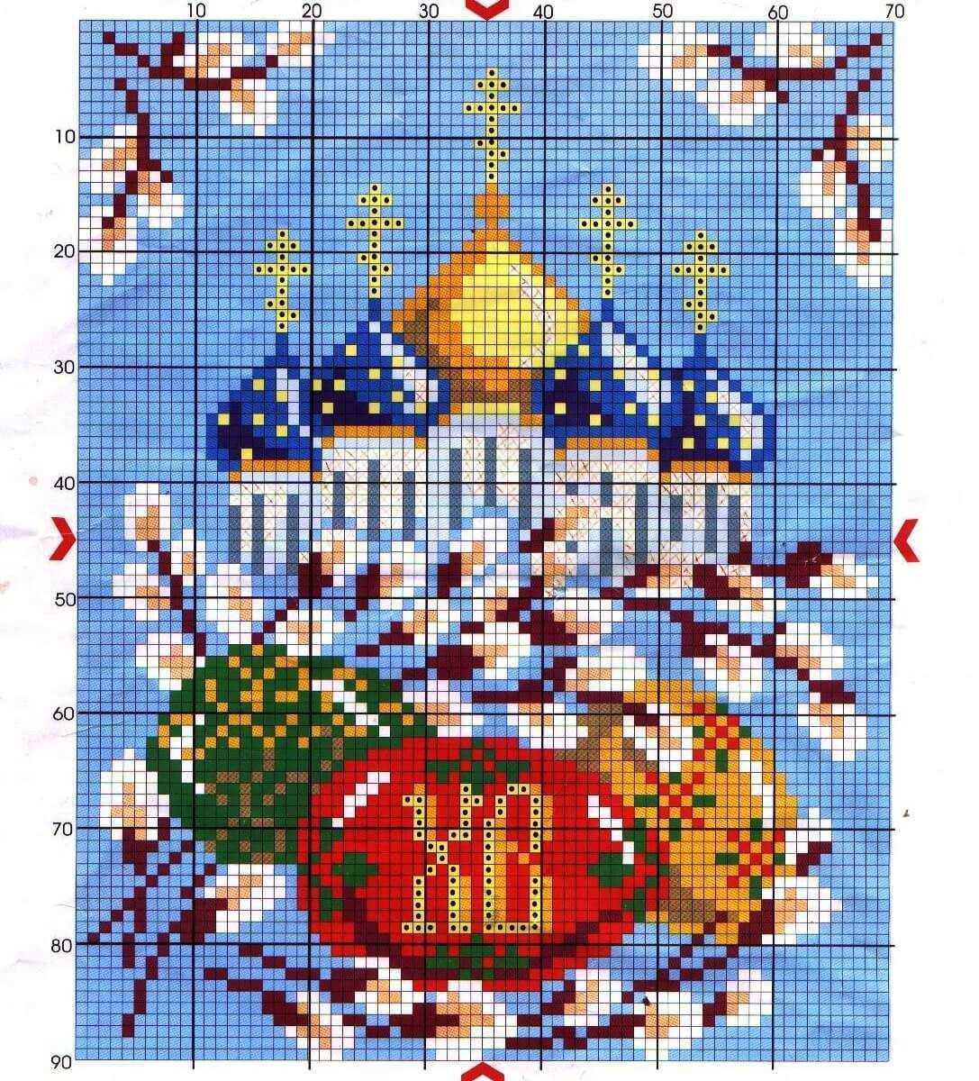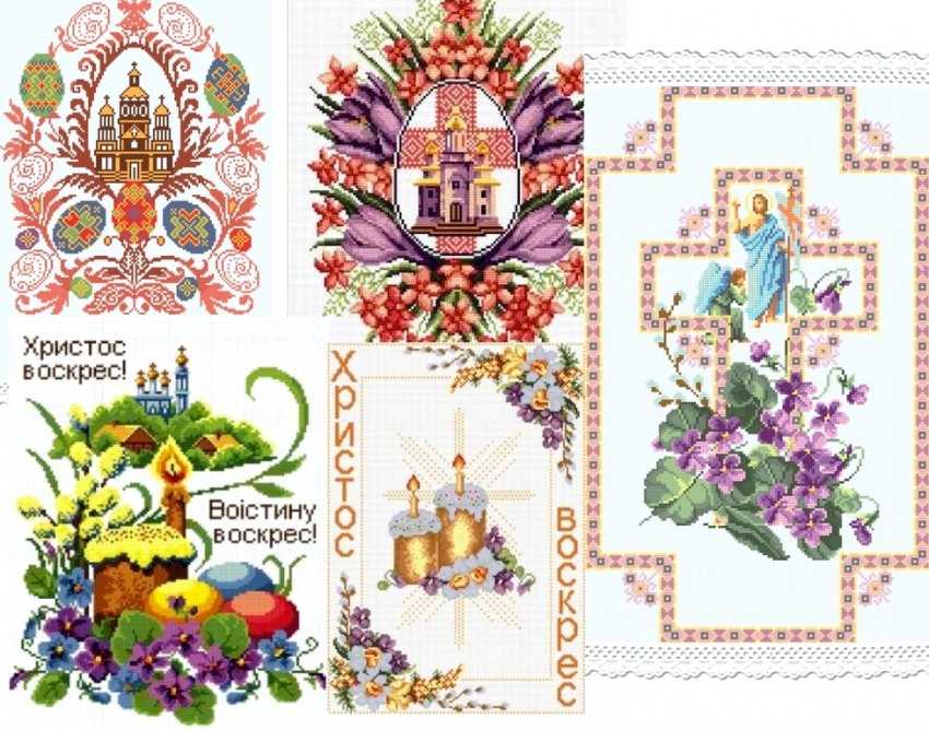 Схемы вышивки к Пасхе, которые раньше изображали в основном куличи, церковные купола и другую православную атрибутику, в последние годы обогатились мотивами из западнохристианских : желтые милые цыплята, веселые пасхальные кролики, яркие крашенки и весенние цветы. Это делает праздничную атрибутику еще более светлой и радостной, как и сам праздник.