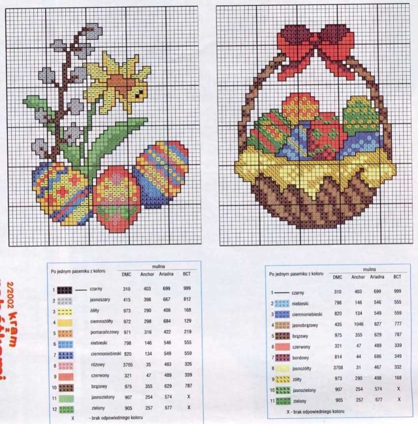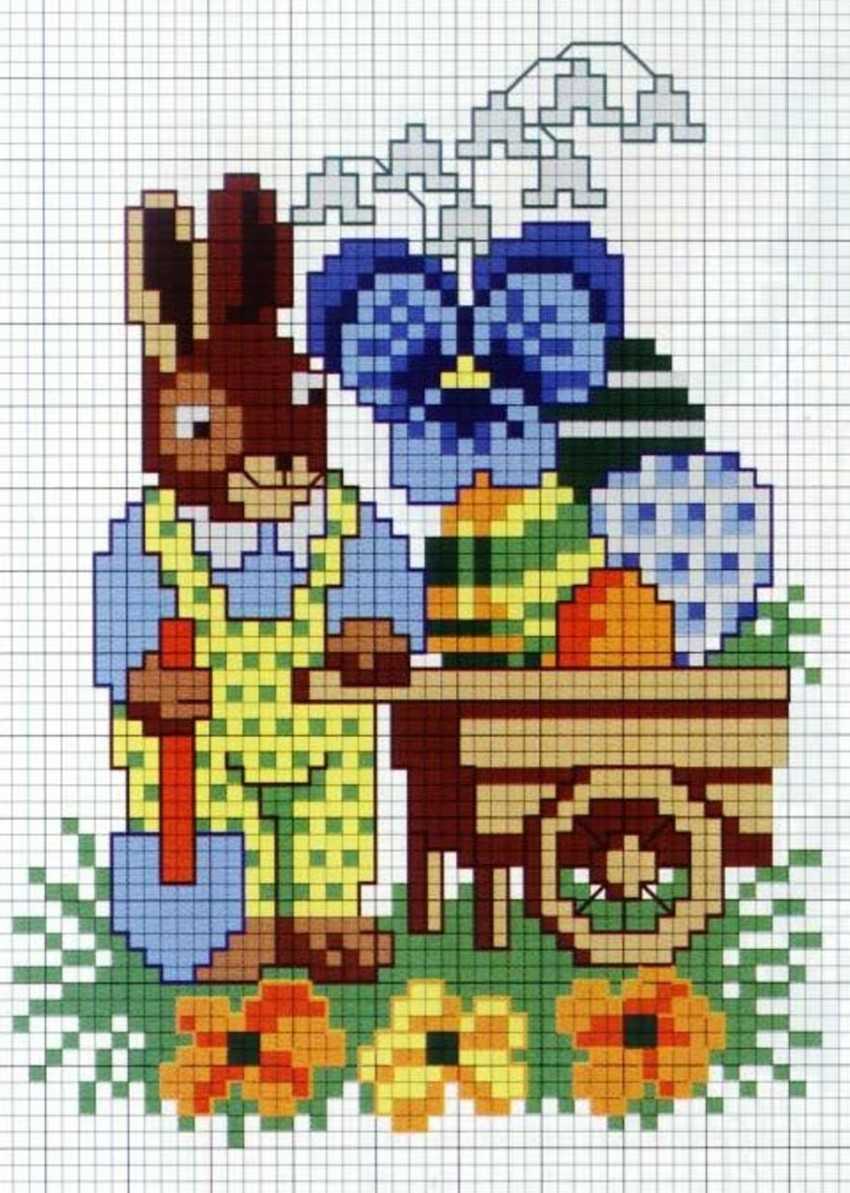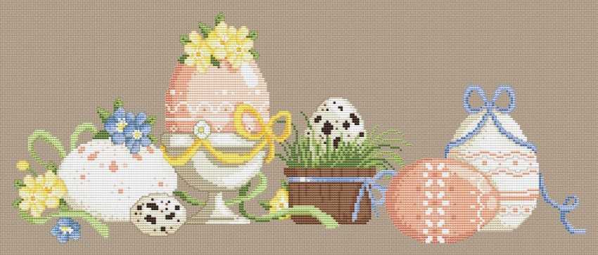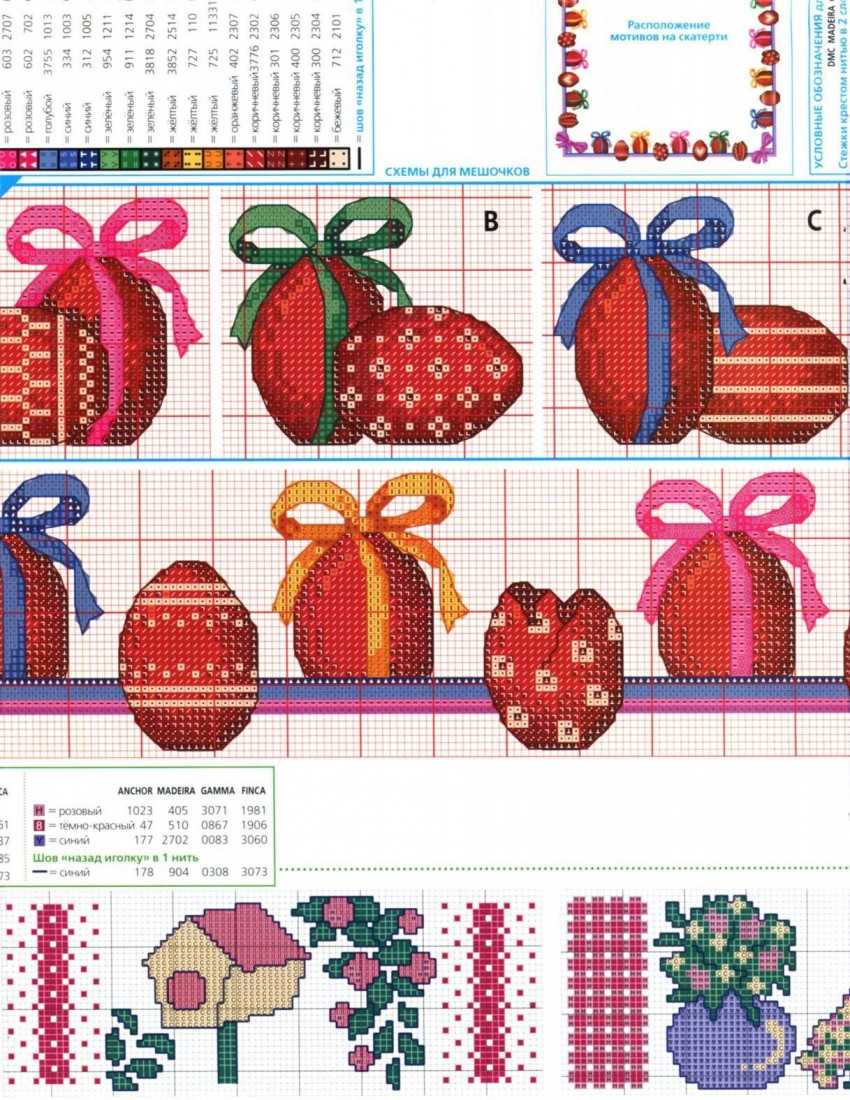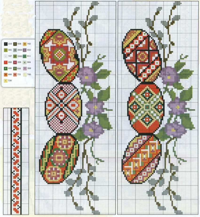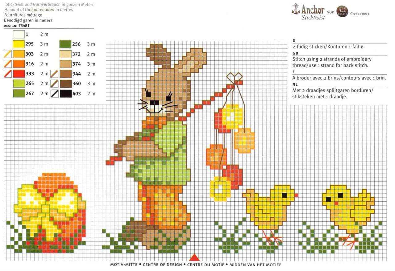 Схемы вышивки к Пасхе, которые раньше изображали в основном куличи, церковные купола и другую православную атрибутику, в последние годы обогатились мотивами из западнохристианских : желтые милые цыплята, веселые пасхальные кролики, яркие крашенки и весенние цветы. Это делает праздничную атрибутику еще более светлой и радостной, как и сам праздник.