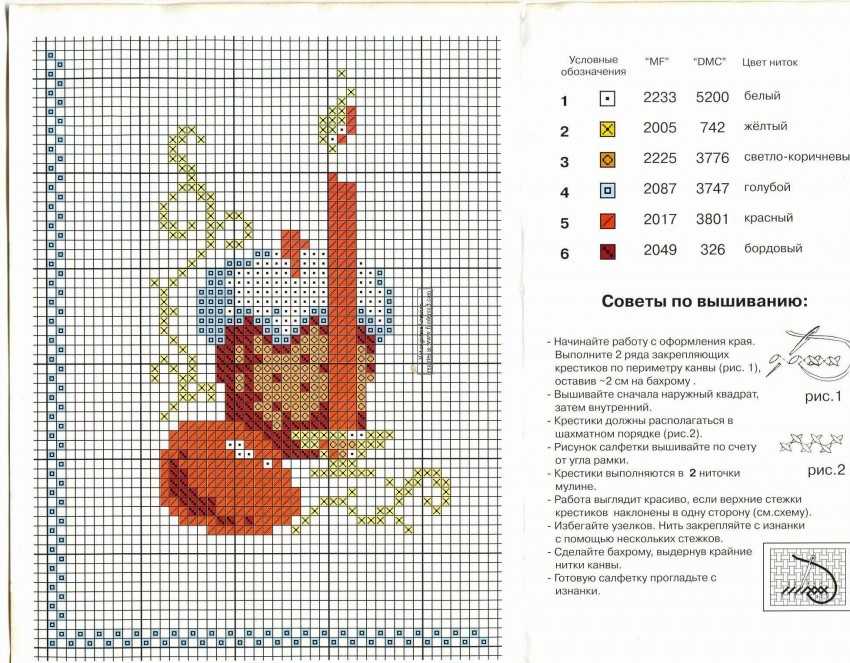 Вышивают нитью в четыре сложения. При этом один крестик вышивается на двух клетках ткани. На схеме имеются пунктирные линии, это контур, его нужно вышить светло-коричневой ниткой в два сложения строчным швом.