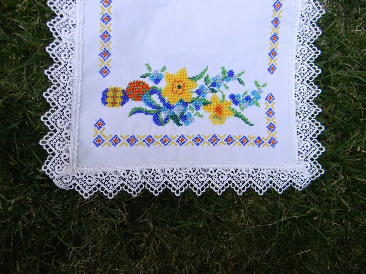 Когда все будет готово, нужно подогнуть край салфетки на 2 см. Подвернутый край приметывают и прошивают контур салфетки крестом светло-желтой ниткой так, чтобы захватить подогнутый край. Расстояние до края при этом должно быть равно 2 см. После этого наметочные нитки можно убрать. Готовую салфеточку проглаживают с изнанки через влажную тряпочку. Получим изделие, как на фото.