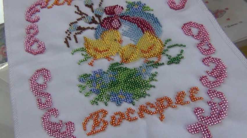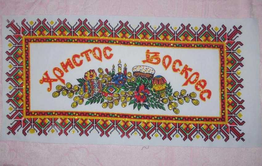 - как только отделка краев пасхального рушника завершена, смело приступайте к созданию рисунка. Это может быть вышивка нитями, или же вышивка бисером на Пасху — все зависит от ваших способностей и желания;