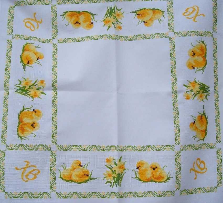 Изготовление пасхальной салфетки Из ткани нужно вырезать квадрат нужных размеров и сделать обметку по контуру. Цыплят в корзинке вышивают по схеме, представленной выше. Рисунок должен находиться в одном из углов квадрата на расстоянии 7-8 см от края изделия.