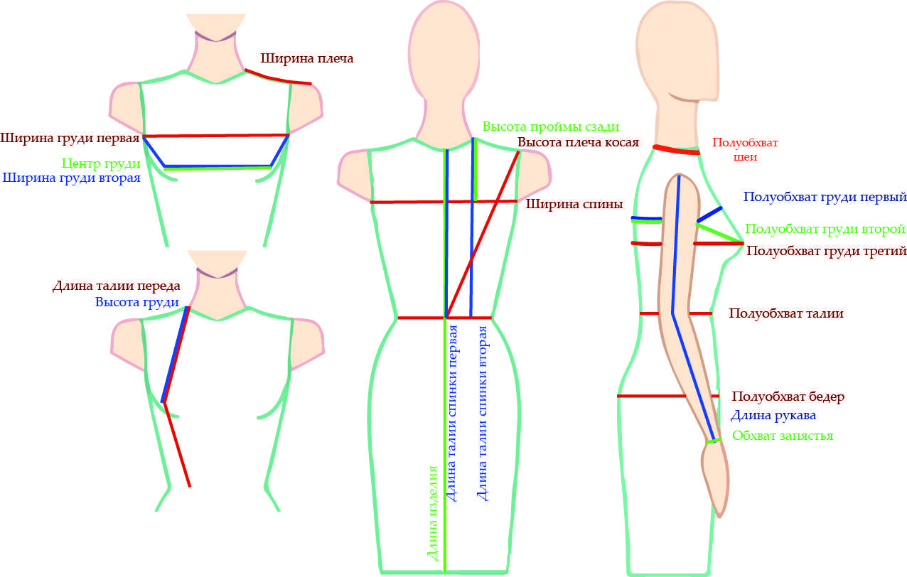 Нужны обязательно и второстепенные мерки, которые определят длину рукава, ¾ рукава, обхват руки, шеи, расстояние от шеи до груди.
