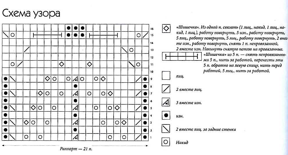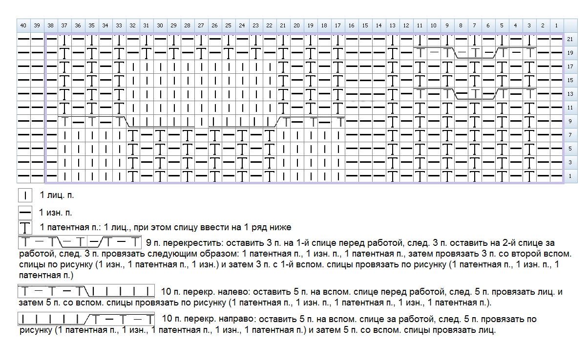 Дальше вяжем так: три изнан., 21 пет.узора по схеме, * три изнан., три лицев.*. От звездочки и до повторяем четыре раза.