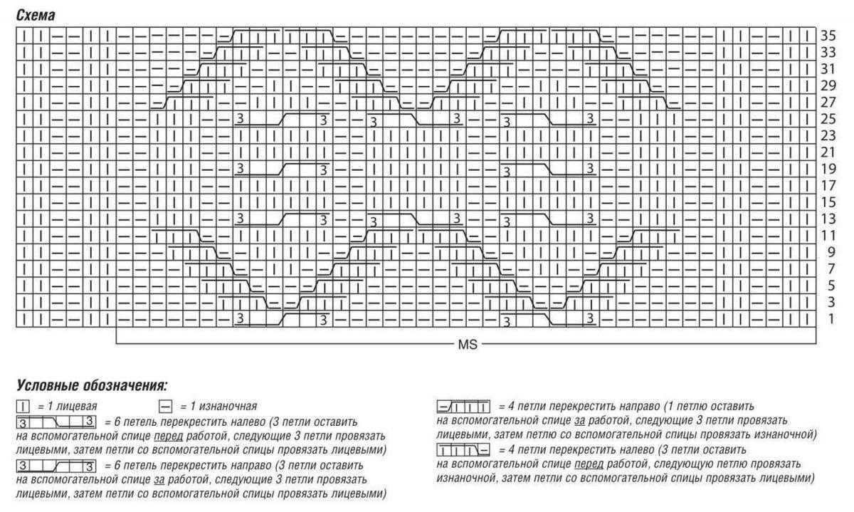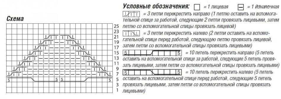 Основной узор: число петель кратно 14+8. Вяжите по схеме. На схеме приведены только лиц. ряды, в изн. рядах все петли вяжите по рисунку. Повторяйте узор с 1-го по 24-й ряд.
