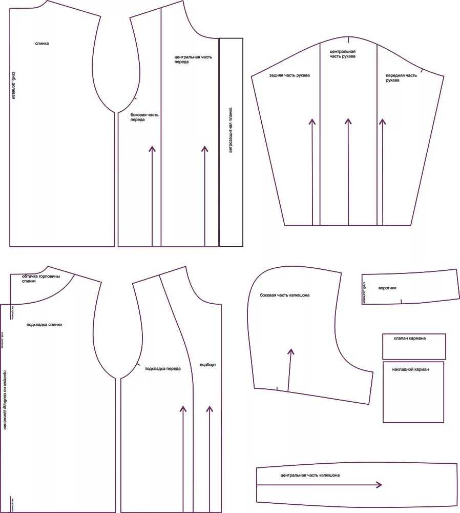Для того чтобы полностью рассказать о том, как сделать выкройку, мы возьмём модель куртки с капюшоном. Она практически ничем не отличается от классического варианта. Здесь лишь добавляется дополнительная схема для капюшона, который пришивается в дальнейшем к основной части куртки.
