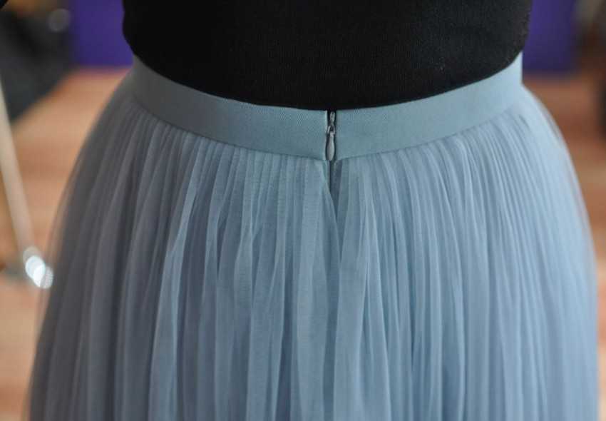 - Вшиваем молнию, предварительно горячим утюгом прогладив это место. Работать с фатином очень тяжело, поэтому можно использовать дополнительный кусок плотной ткани, чтобы максимально эффективно закрепить на ней молнию.