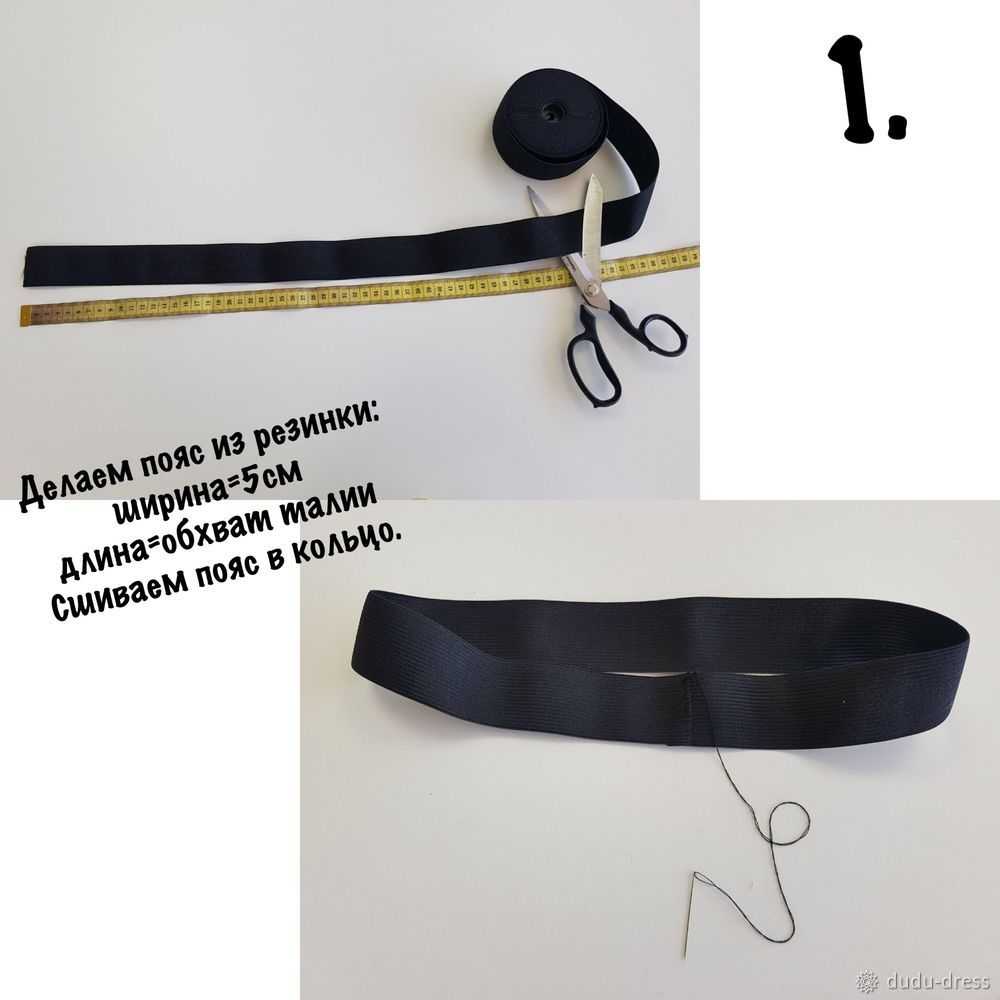 1. Изготавливаем пояс из резинки: отрезаем длину=обхвату талии, складываем в колечко и сшиваем. Никаких припусков не нужно, резинка тянется и прекрасно сядет на талию.