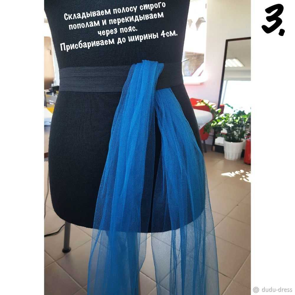 3. Одеваем пояс на манекен/подругу/мужа/спинку стула, берём полосу и продеваем её строго пополам через пояс как на фото. Аккуратно присбариваем полосу до ширины около 4см.