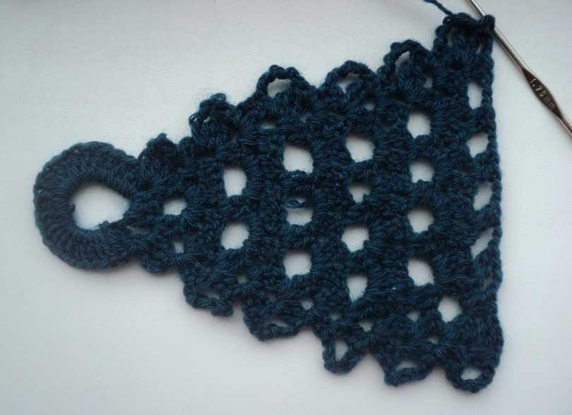 5. Шестую строчку, также увеличиваем на две петли, провязывая по два ст.бн. в первую петлю и уже в 7 петлю строчки (так как в строчке уже не 10 петель, а 12). Таким образом в конце провязаной строчки должно получиться 14 ст.бн.